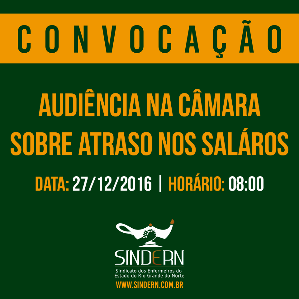 Convocamos todos os Enfermeiros servidores para Audiência na Câmara sobre atraso nos salários, que acontecerá amanhã, 27/12, às 08:00.
